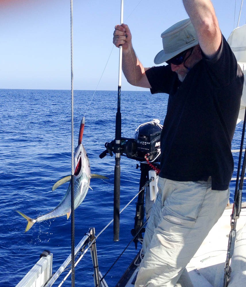 This is a pretty small Ahi, they get well over 100 lbs.  Interestingly, he wasn’t nearly as strong a fighter as the Skipjacks even though he was a little bigger. One reason might be is the Skipjacks are some of the “warm-blooded” tunas.  Cleaning them quickly after they land on deck you can feel the heat in their bodies. Kind creepy actually, filleting a fish with meat that is body temperature.  Much warmer than the water around them.  Not true with the Ahi. Like “normal” fish their bodies are at water temperature even after a fight on the line.