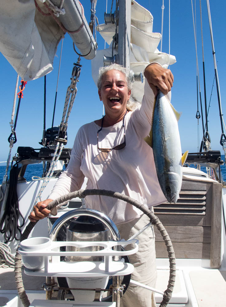 And then a little further along, Karen caught her first fish–ever!  A small yellowtail.  If you are a sushi fan you might know these as “hamachi”.