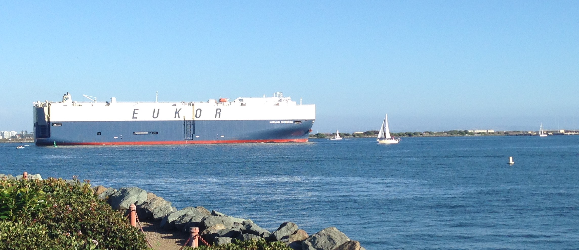 This is a picture of a 40 foot sailboat exiting San Diego bay , that I took yesterday. The cargo vessel ( Bill says it’s a car carrier) is at least 800 feet long. A reminder of why we keep watch in the middle of the night in the middle of seeming nowhere!