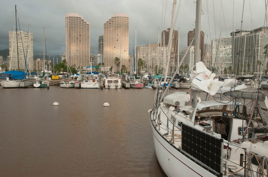 The view to the east where the Fetchin’ Ketch rests toward the hi-rise resort hotels of Waikiki
