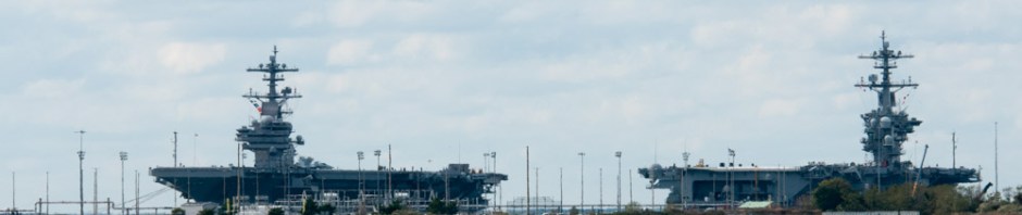 We are anchored just off the Naval Station here in Norfolk, VA. Norfolk is by far the largest Navy presence on the east coast. The above photo taken from our deck, is of the George W. Bush, and the Abraham Lincoln. Two, of the ten, 1100 foot long, 100,000 ton, $8Billion, nuclear powered, Nimitz class aircraft carriers. Pretty much all day and much of the night, the Navy helicopter pilots are using our mast as a turning pylon for their take-off and landing practice. Over… and over.