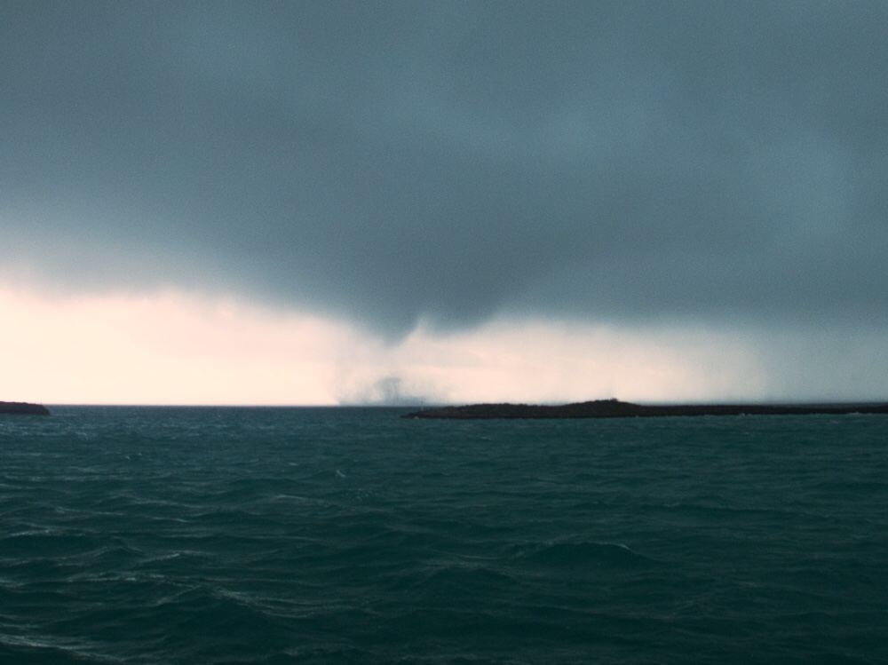 It certainly doesn’t look like much in a still photo, but the rapidly rotating winds of an incipient waterspout/tornado are not something anybody wants nearby. Off to the right you can see the gray wall of rain.