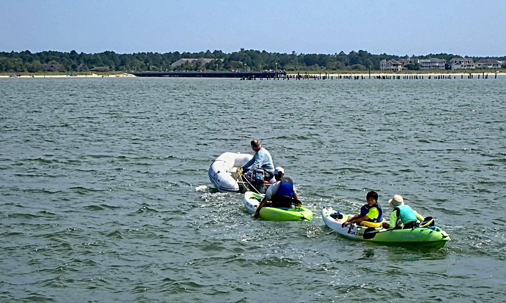 Before they accepted a tow, they asked me to go check on Mom and her friend. I buzzed over to them, and the ladies insisted they were OK (Yeah, right!) so I went back to Dad and the kids, and told them I’d tow them into the beach, and then come back to check again on Mom.