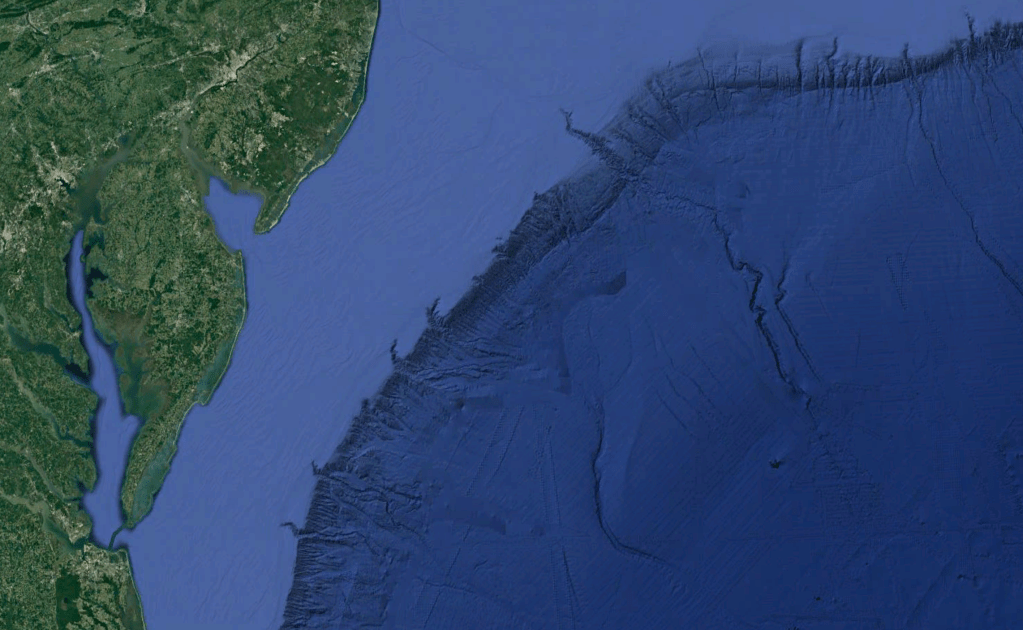 A Google Earth image of the Canyons on the continental shelf from New York down to Virginia