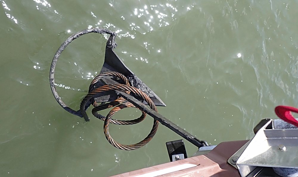 …our “friend” shows up again. We never saw the whole thing, or what, if anything, it was attached to. Careful study of the photo would show that what we have is really just a loop of cable over the anchor, but try as we might, we can’t get it off. We eventually tied a line to the anchor, and disconnected the chain. We lifted, we bounced, we dragged, we puzzled.