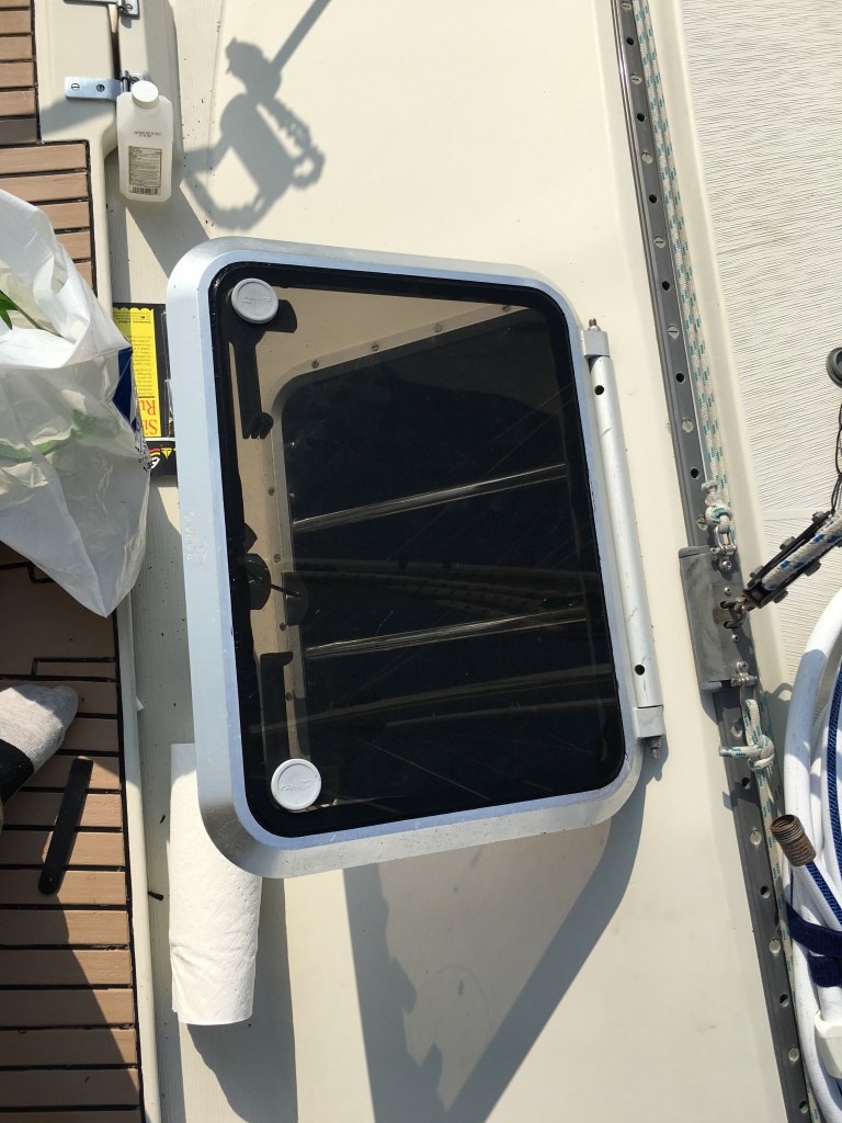 Next on the Rule One list was the overhead hatch in the saloon. This was replaced when we had major repairs made in this area two years ago. We have been happy with the style and function of the hatch, except in severe conditions the gasket leaked. Not good. See Rule One above.