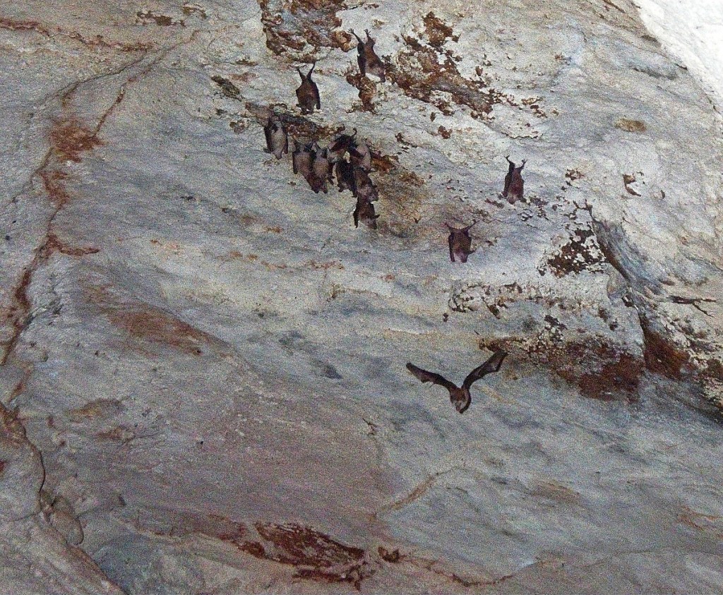 BATS! Clinging to the rook in the very darkest corners of the cave are these small bats. Karen could hear their high pitch chattering, I could not. There are about a dozen species of bats in the Bahamas, I have no idea which these are…
