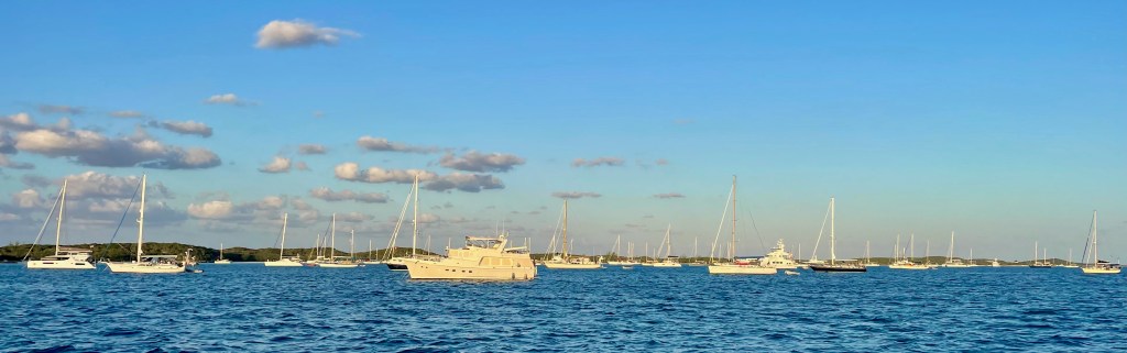 Right now we were told there are something on the order of 400 (!) boats here, from sub-30 foot pocket cruisers to 180 foot super yachts. Certainly too many for us to casually count. This is a major social gathering place and resupply port for cruisers in the southern Bahamas. Many boats come here for the entire season. For us, it feels very crowded–almost claustrophobic. There are compensations however: Meeting people who are either old, or new friends. And the grocery shopping.