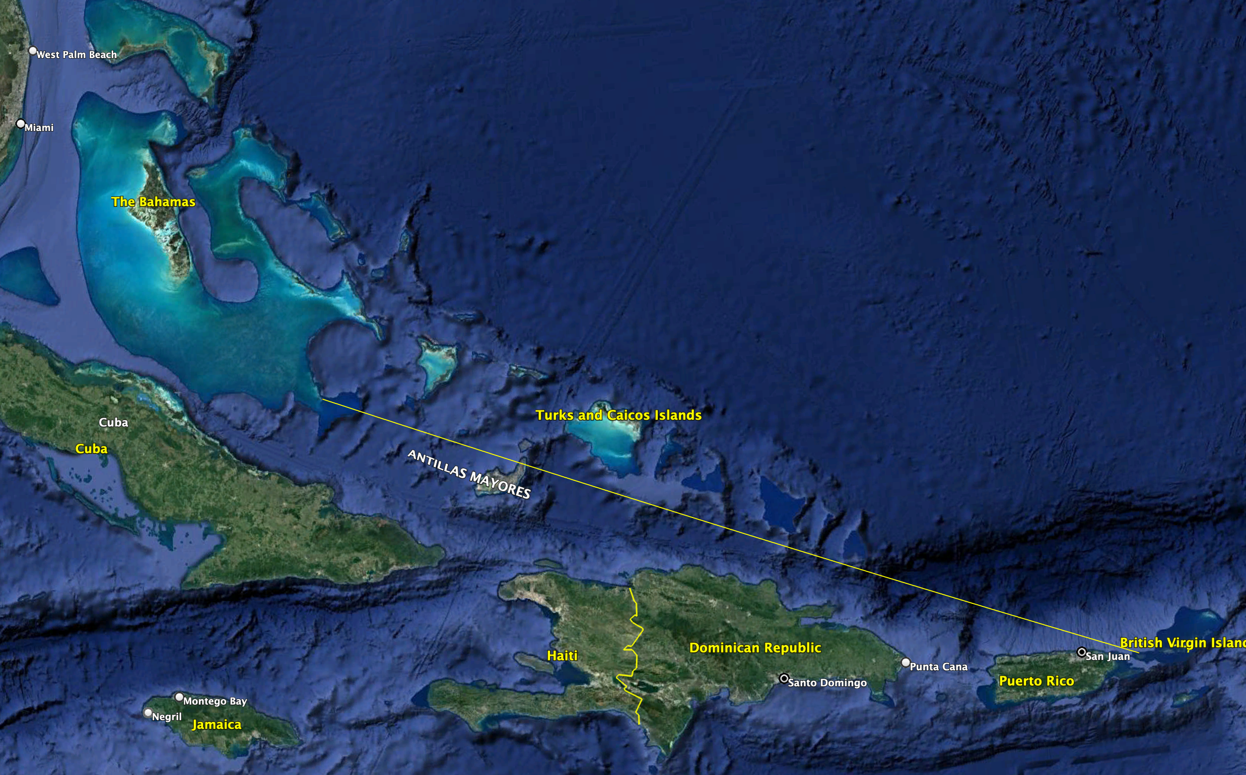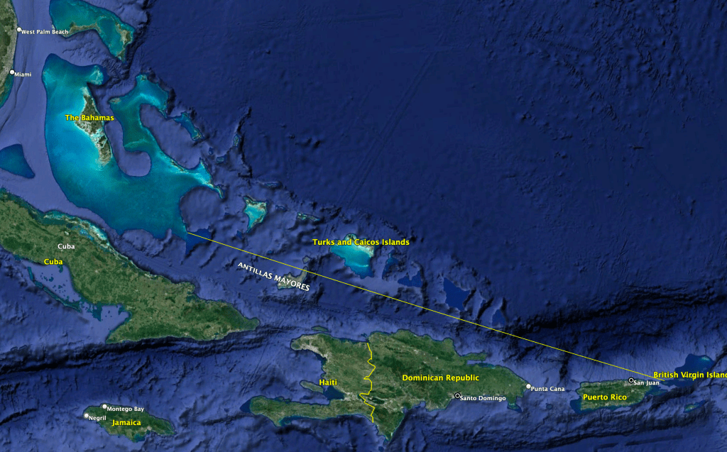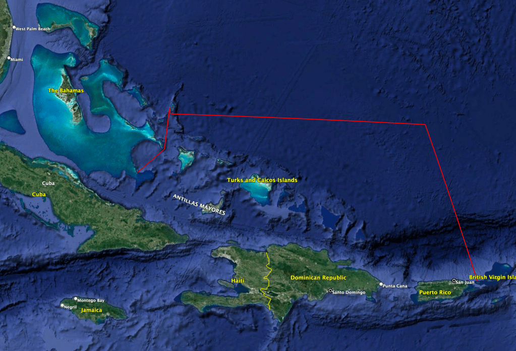 The next destination for us is a place we have been before, the island of Culibra. Politically, it is part of Puerto Rico (and hence, the USA), geographically it is one of the “Spanish Virgin Islands”. From our current location Culibra is 630 nautical miles to the southeast. There are two complications to this plan.