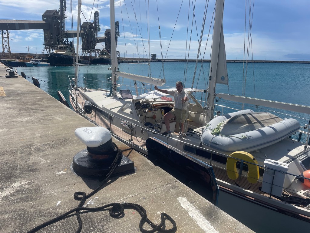This is more than a bit of a pain, tying a 53 foot sailboat to a dock designed for a 100,000 ton cruise ship is not simple. Everything from the bollards to the fenders is just not to our scale. Getting off, and back one, the boat is a gymnastic exercise.