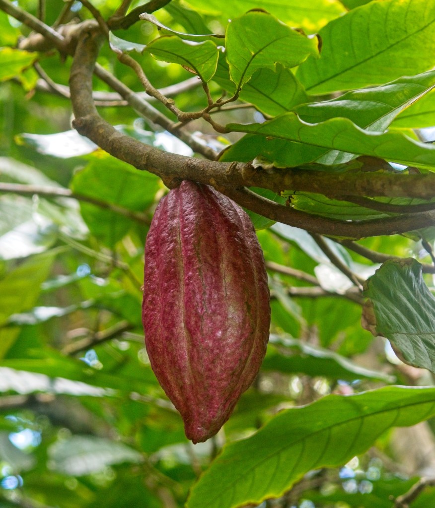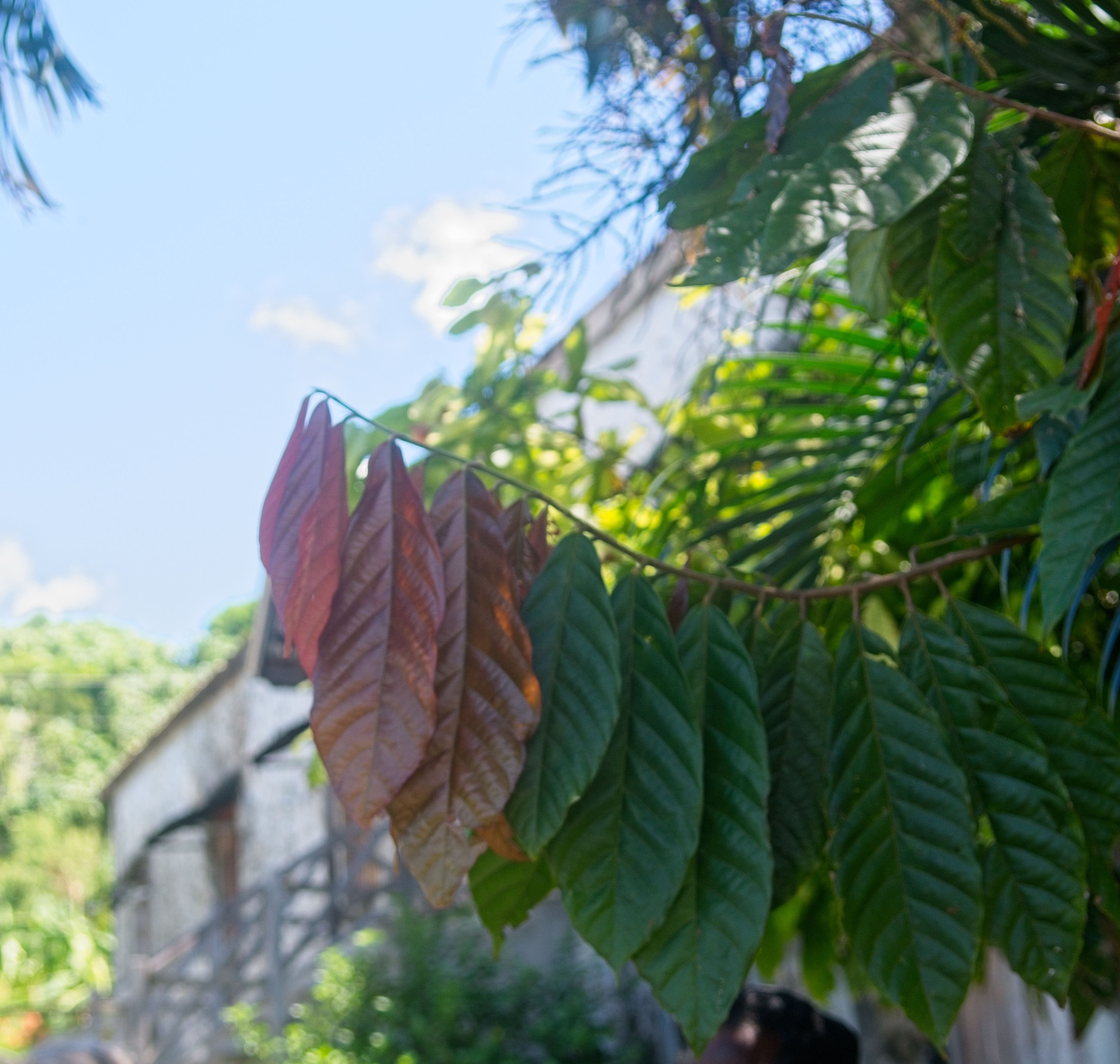 The Cocao tree grows very well here. It is easily recognized by its large drooping leaves, and the red-brown color of the young leaves.