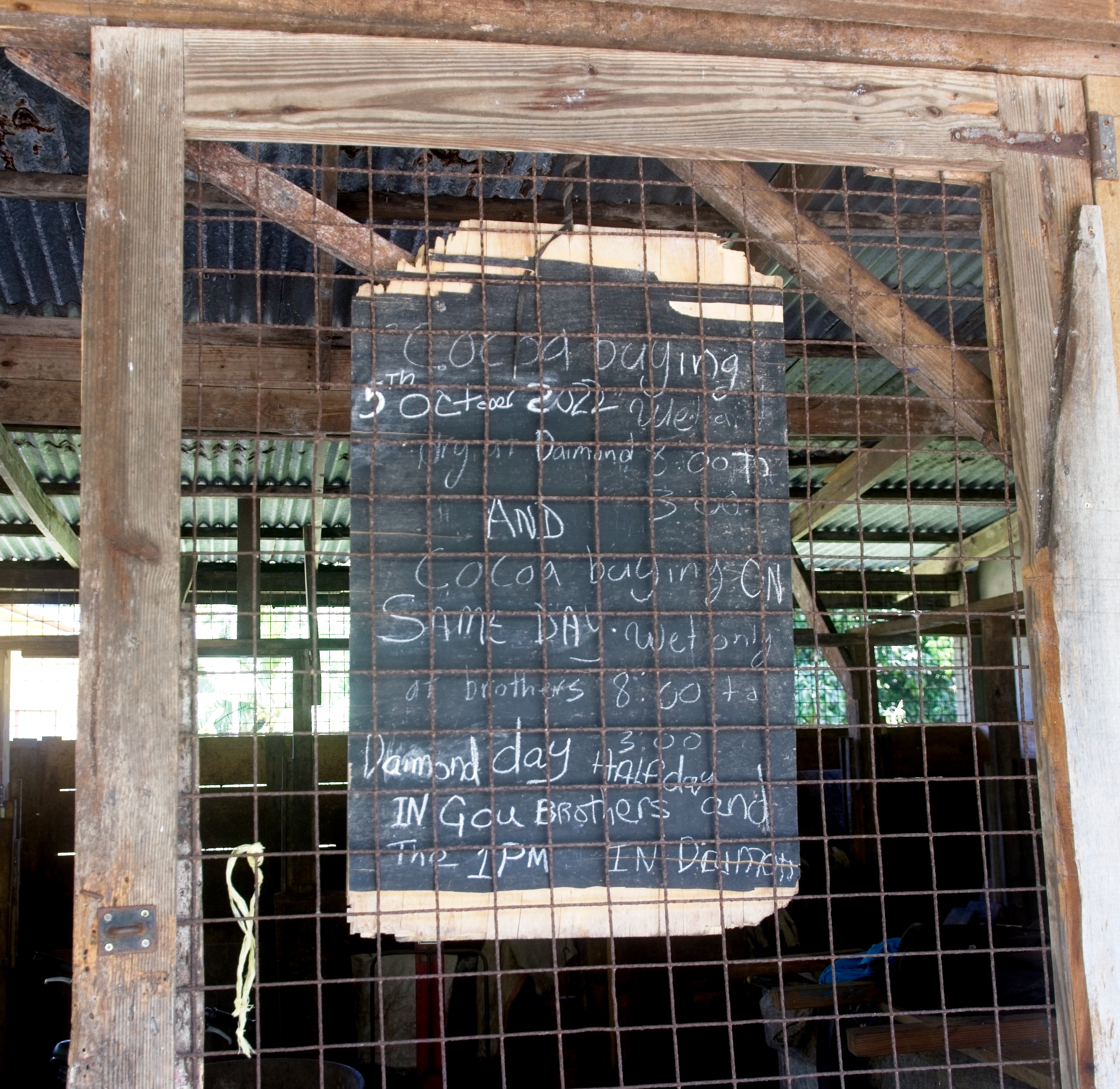 The local chocolate factories buy the seeds from the farmers. The chalkboard lists the places they will be buying this week: