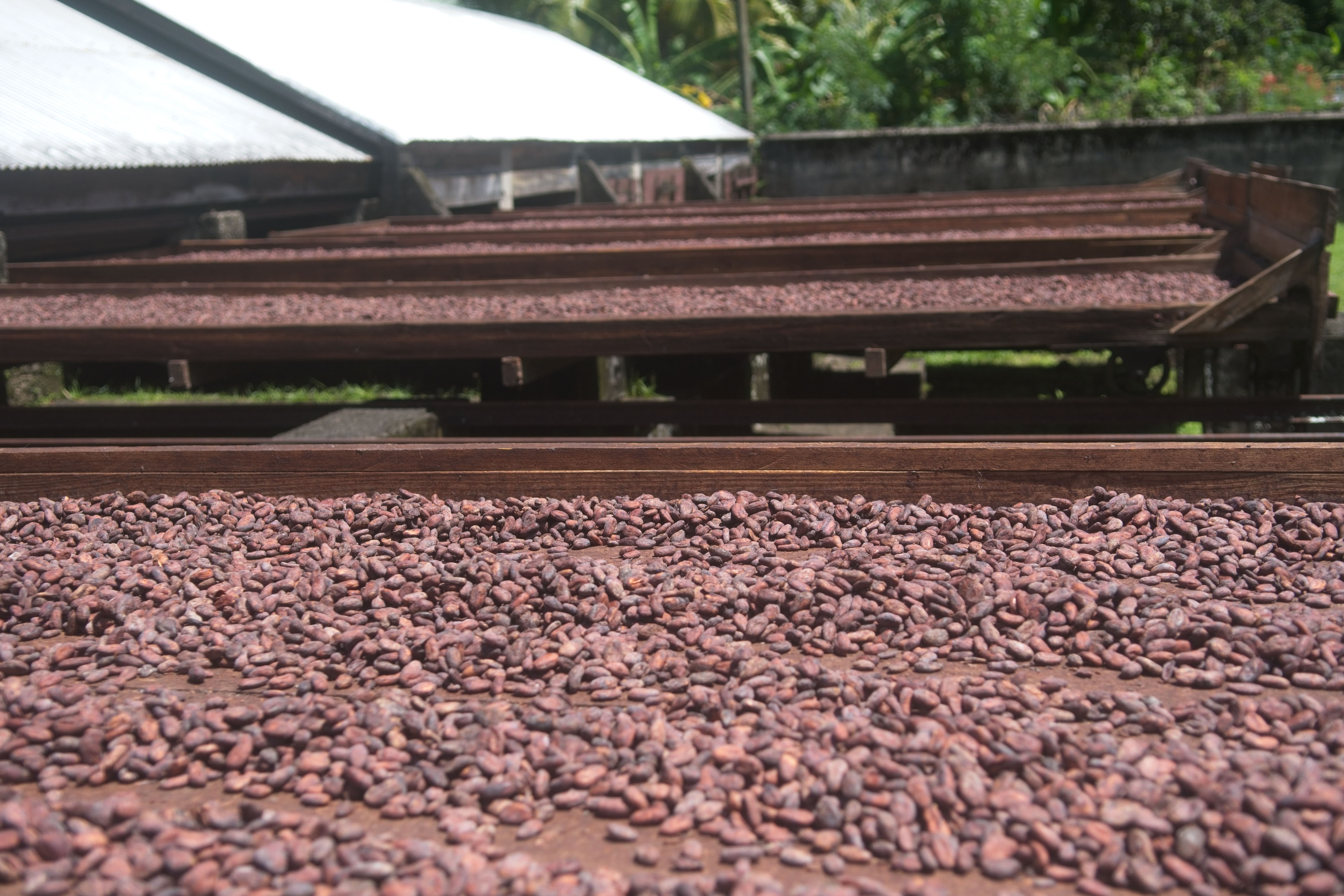 The first step in processing is to cover a pile of the wet seeds in banana leaves and leave them to ferment for about a week. They come out of this process a dark brown, and are ready to dry in the sun. Spread on large trays that run on rails so the crop can be pushed under cover if rain threatens.