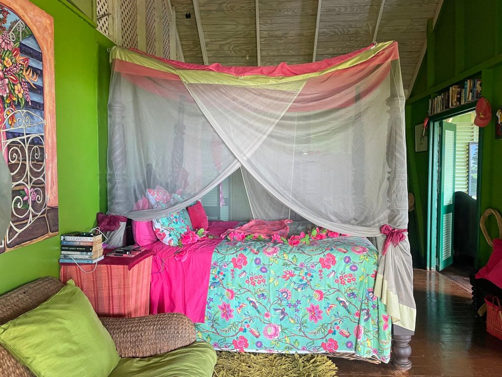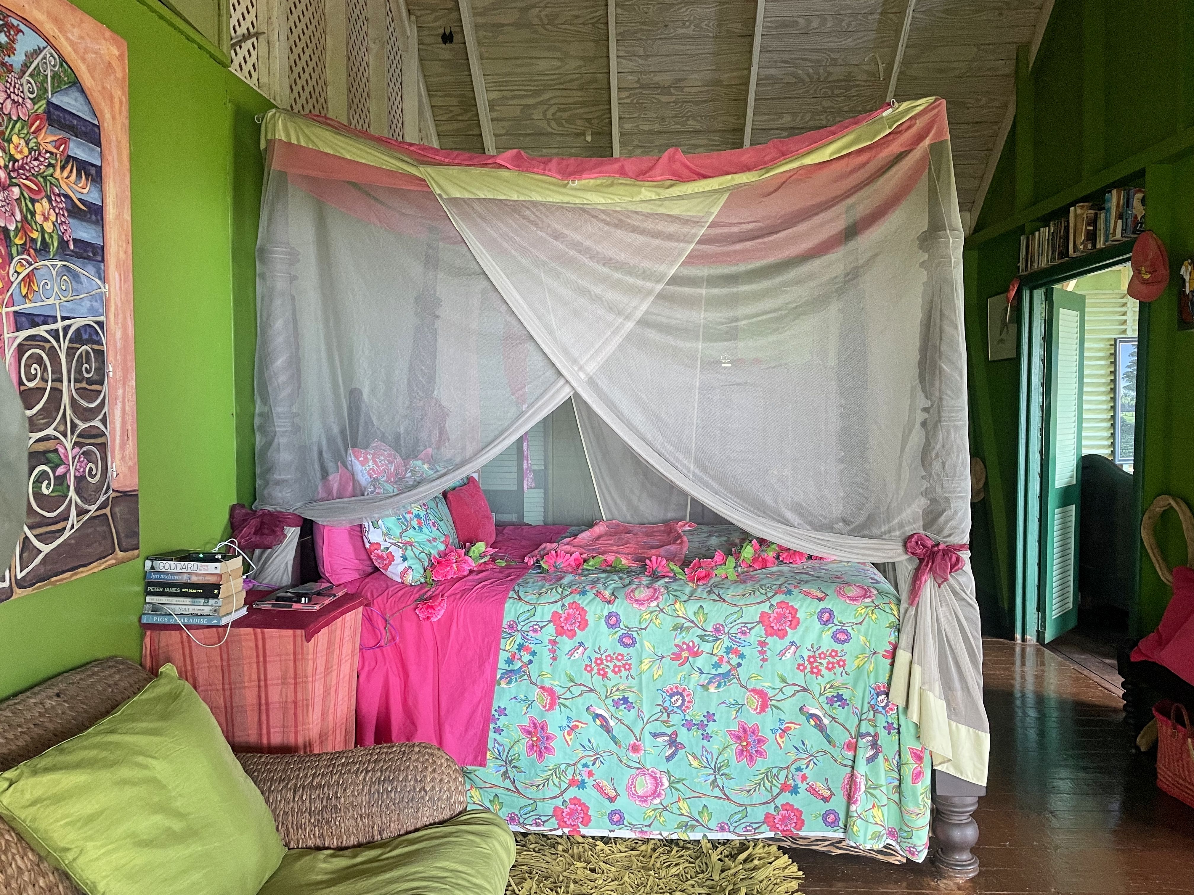 Of course if you open your house to the world, you have to occasionally expect some guests who will have varying degrees of welcome. With neither glass nor screens on the windows, mosquito netting is an important bed accessory.