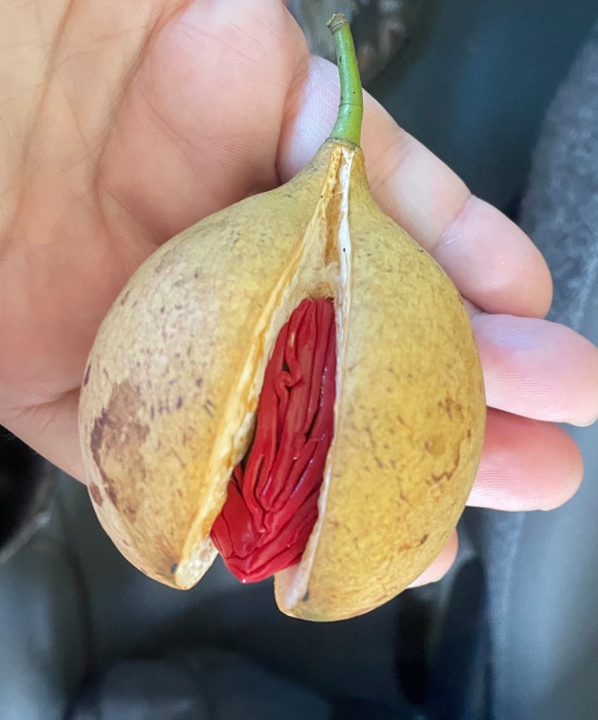 Nutmeg is a medium sized tree, a bit unusual in its a pyramid shape, where most tropical forest trees have high spreading crowns. The fruit has four parts: