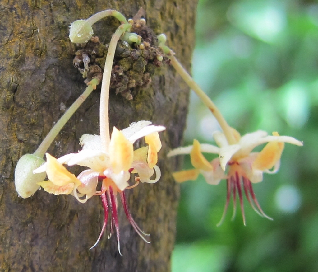 The small trees have an unusual fruiting habit. Instead of flowering on new growth, the rather small flowers sprout from the trunk and main branches.