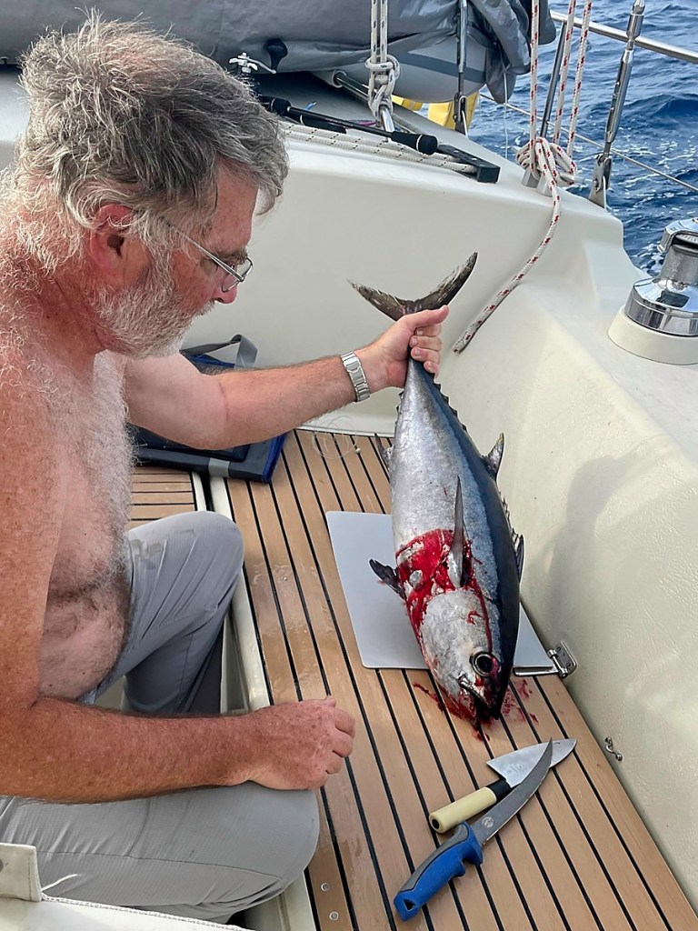 We did have a successful fishing trip. A king mackerel, a false albacore, two barracuda, a small mahi-mahi, and… a blackfin tuna! Blackfin are not large tuna, a REALLY big one is 30 lbs. But they have been a stable on Harmonie’s sushi menu because they are quite common in the waters we sail in. We can take a 10 lb. tuna like this and convert it into 6 lbs. of high-quality sushi. The fish are landed, and bled immediately, then cleaned and butchered quickly. Usually in the freezer within an hour or so of swimming, they come to our table as good as the best on the market.
