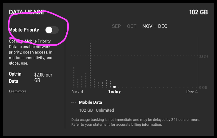 So if you have the MOBILE REGIONAL or the MOBILE GLOBAL which come only with Roaming data how do you connect to the internet when you are offshore? Not to worry, there is an answer for that. You can temporarily turn on Priority Data that will allow you to use your system while out on the ocean, and while moving at speeds greater than 10 miles per hour. This is billed in addition to your normal monthly plan at $2/GB. This is turned through the Starlink website (NOT the app that controls the antenna!). It will be most seamless if you do this before you leave where Starlink considers “land”. It’s not obvious how to do so…
