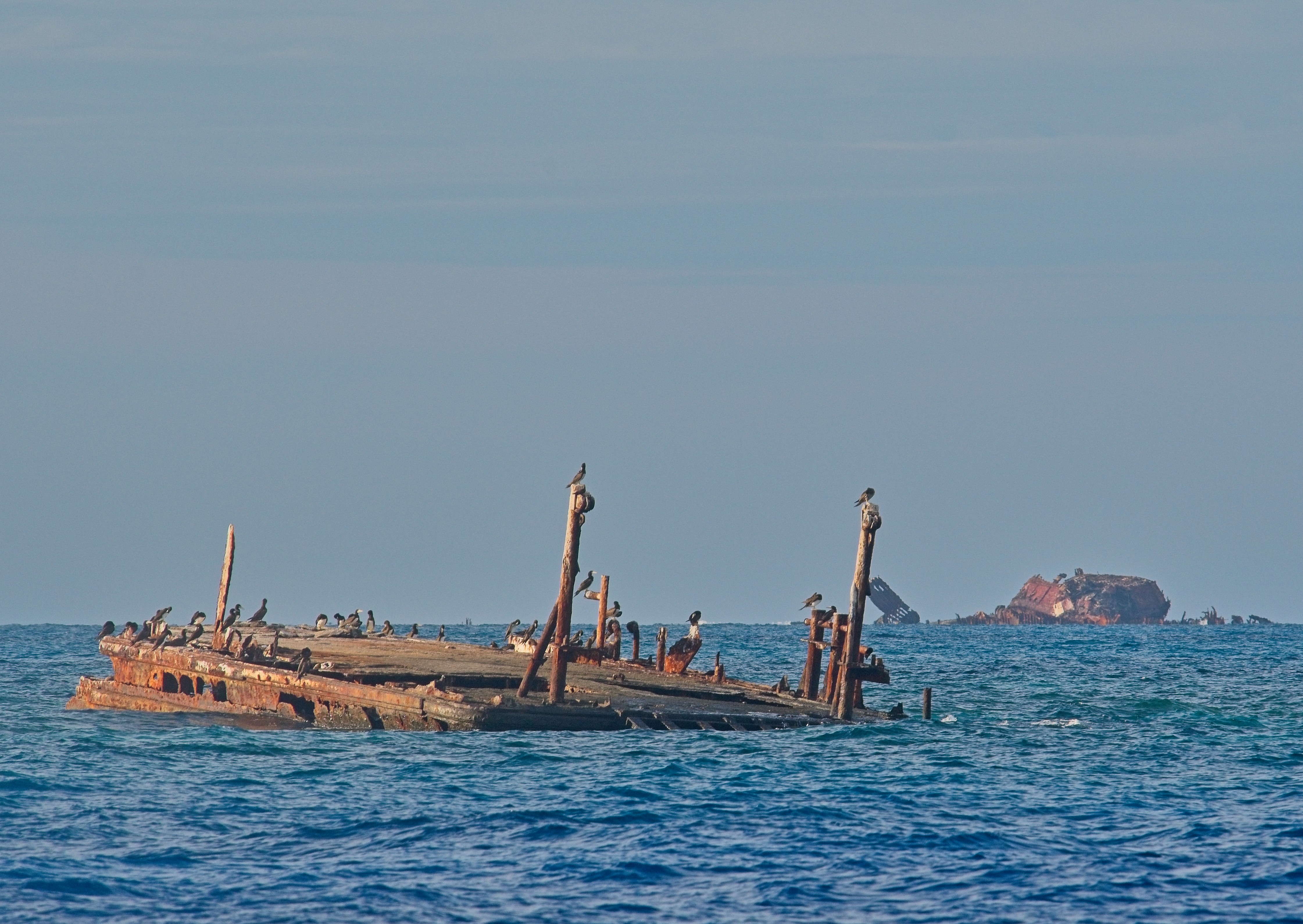 The other two wrecks are steel hulled ships providing more roosting places for the brown boobies. They are on opposite sides of the reef about 3 miles apart. Aside from the two tiny cays, they are the only things above the water surface at high tide.