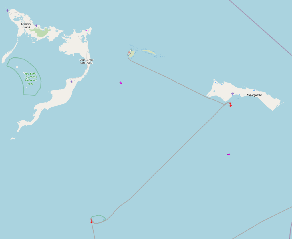 Unfortunately, the weather took a turn on us, and staying anchored at Hogsty Reef was no longer tenable. We packed up and sailed off, first for a night in the well protected harbor at Mayaguana, and then onward to one of our favorite destinations in the Bahamas, the uninhabited Plana Cays where we hope to spend a week or so.