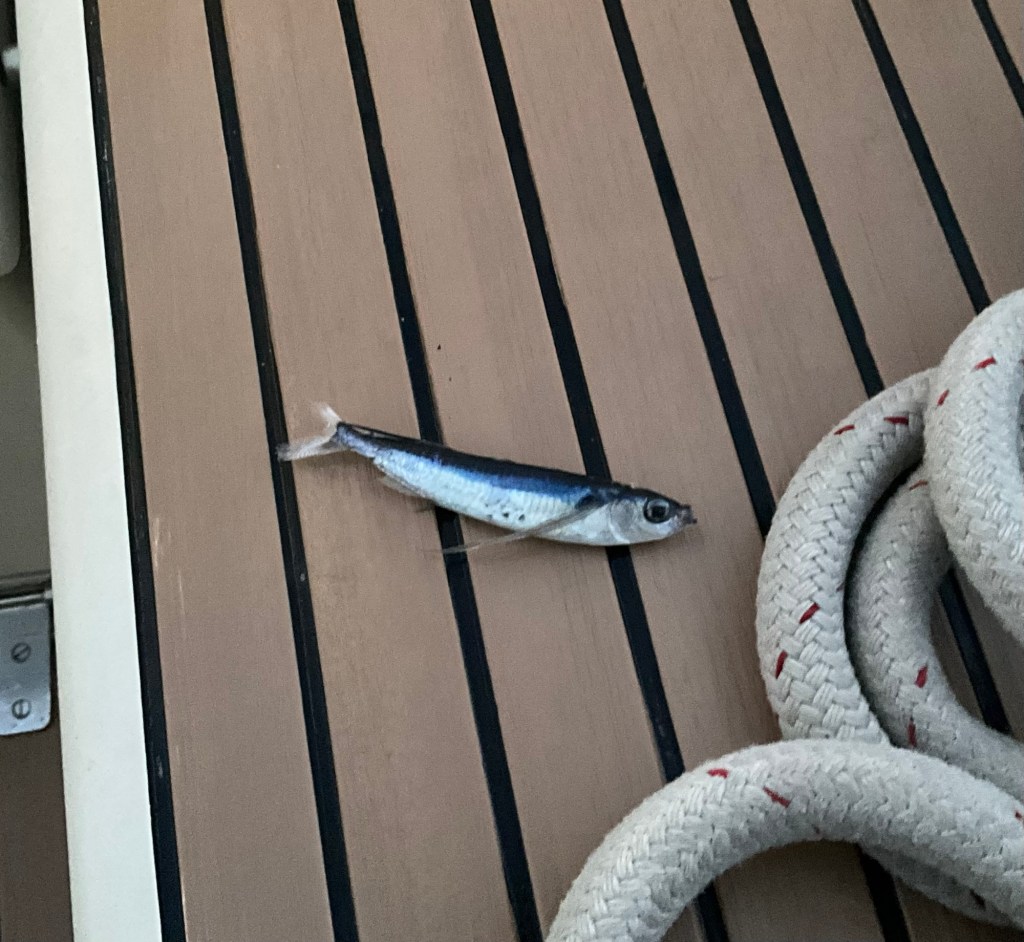 The strongest winds we saw were last night, gusting to about 30 knots. That left us with short, steep seas. Very unusually, we actually took one wave up against the side of the boat hard enough to dump a significant amount of water into the cockpit. How much water? Enough to leave this little guy flopping behind!