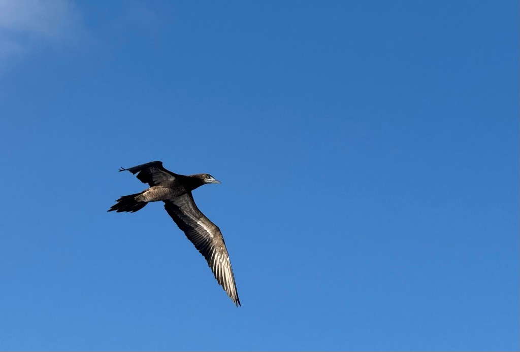 Our first day at sea has been uneventful. We have been treated to two brown boobies using the boat to help them catch fish.