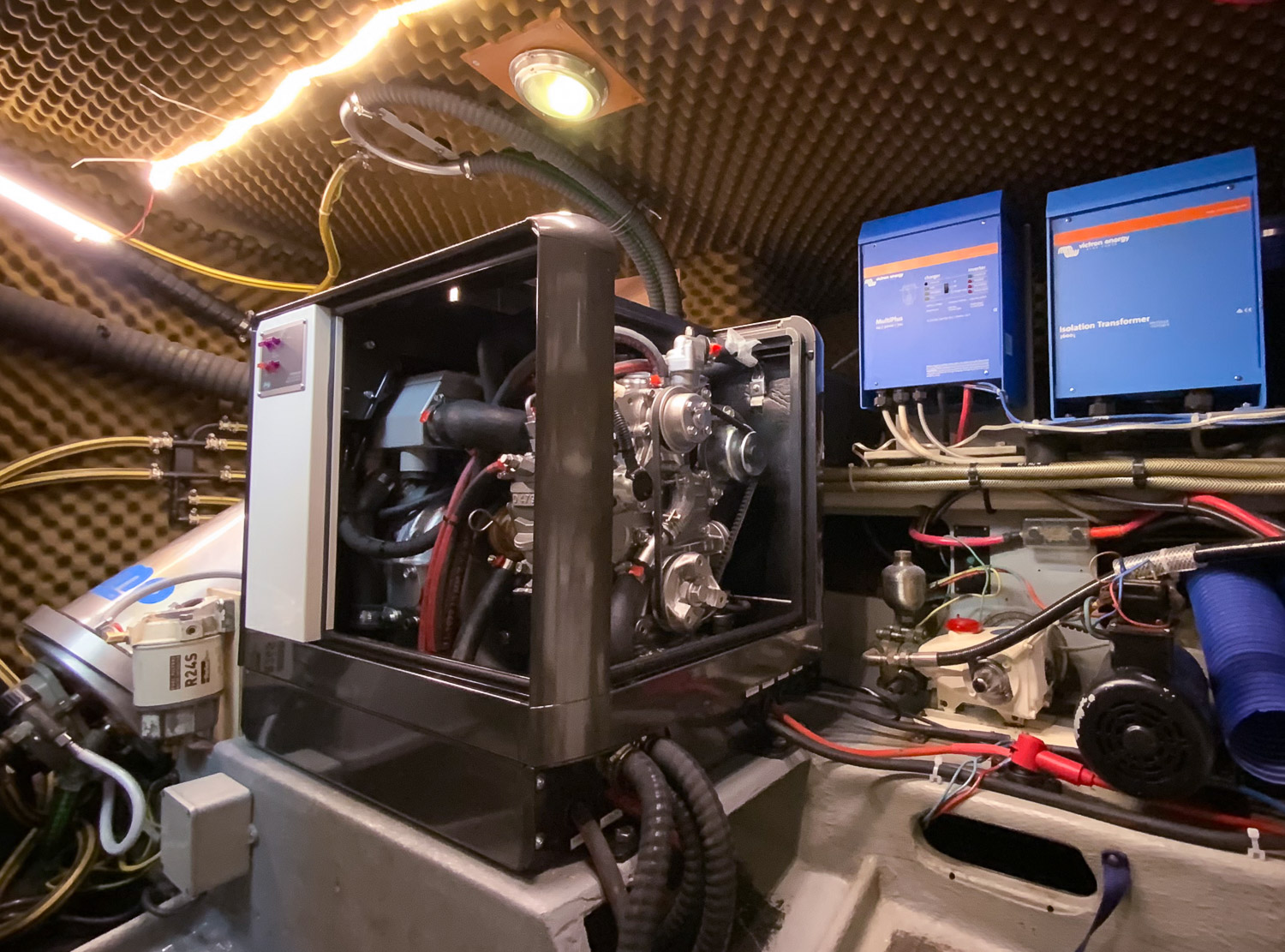 The higher speed engine does inherently make more noise than its low speed cousin, but because it is smaller engine and does not need to be air cooled, we can now put it into sound-proof box and the whole installation is a MUCH quieter both inside out outside the boat.