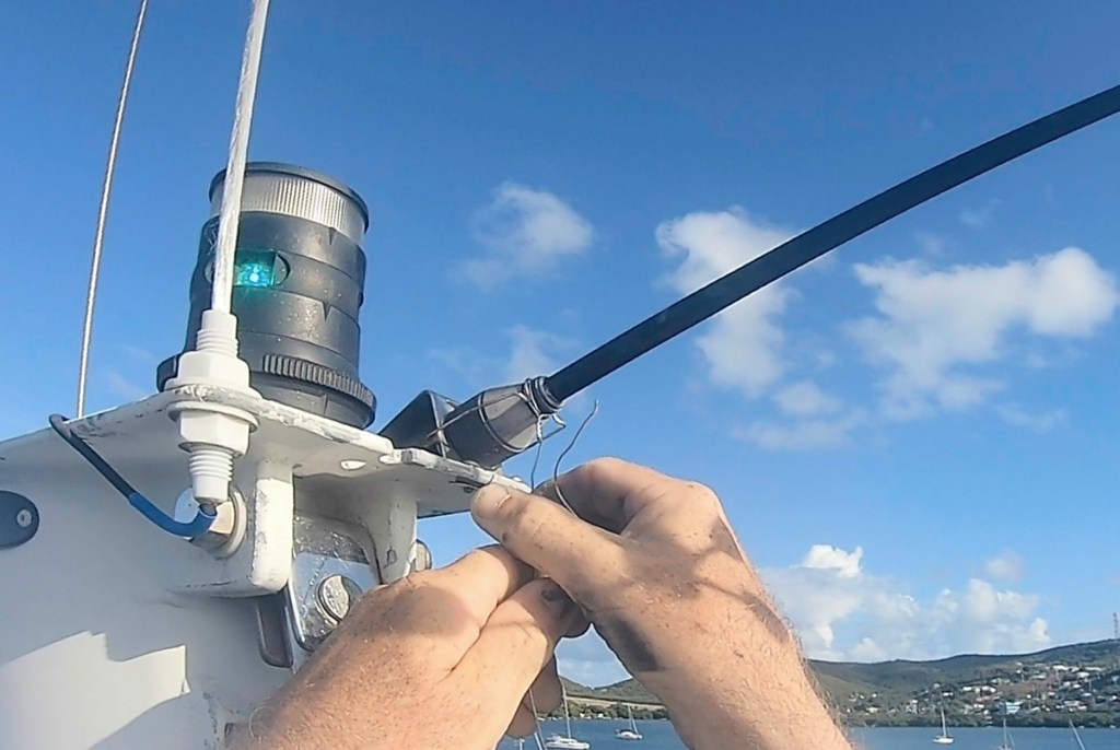 The MHU plugs into the mast head fitting, and then the handnut screws down to secure it, and then a wire bail clips down to prevent the nut from backing off. It looks very secure, and it has been as long as we have owned the boat. The only scenario I can think of is the pounding we took when beating into the winds, knocked the wire bail loose, and then it was only a matter of time before the nut came loose and the wind instrument took a quick trip to Davy Jones’ Locker.