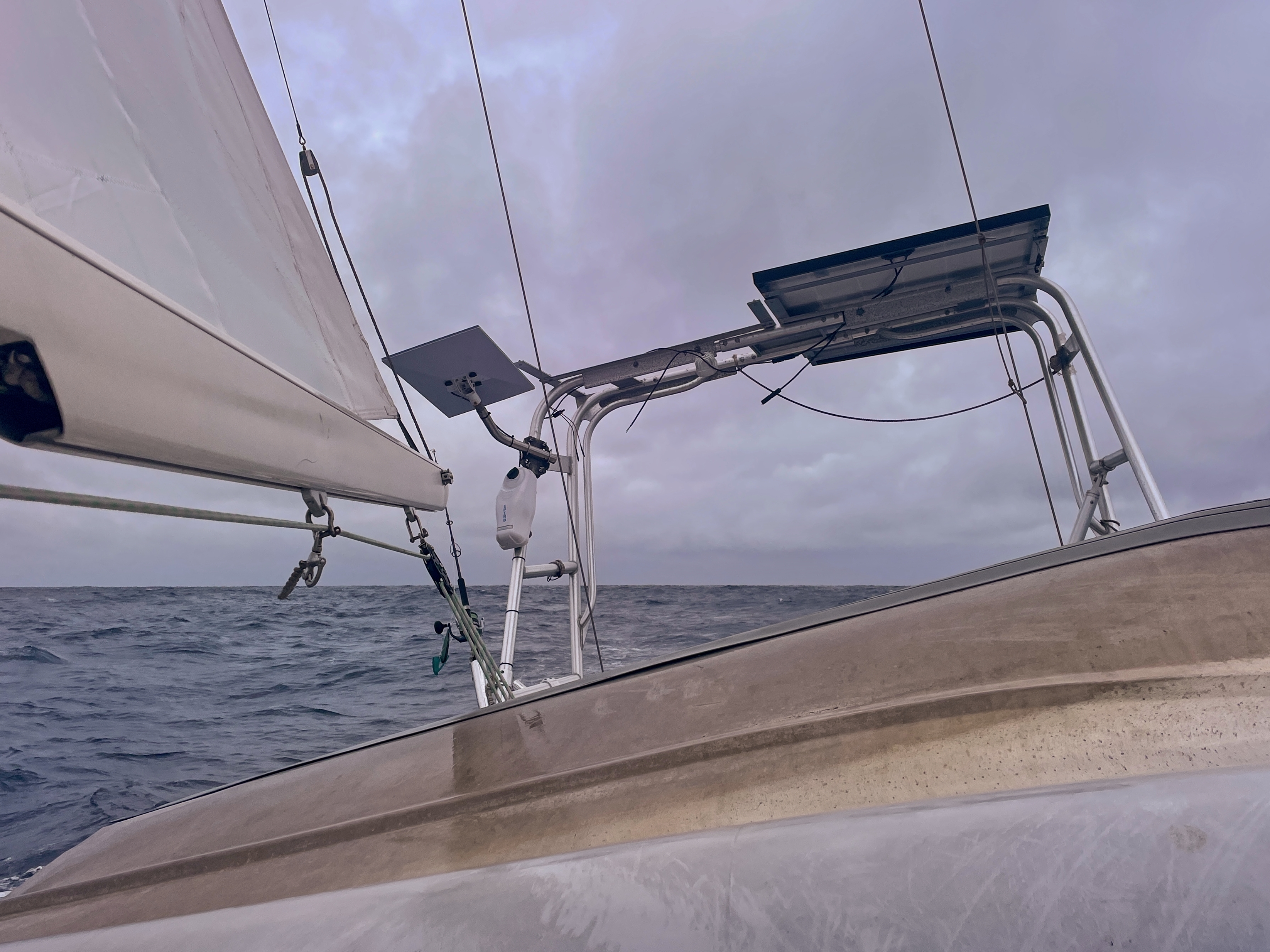 Actually, I had not looked that way, so it was news to me that one of our solar planelss had gone walkabout. I guess having 40+ knots of wind hit it from the bottom when we were heeled over was more than the frame of the panel could take. That repair will have to wait a bit. At least the frame I built is still there, it was the panel itself that failed.