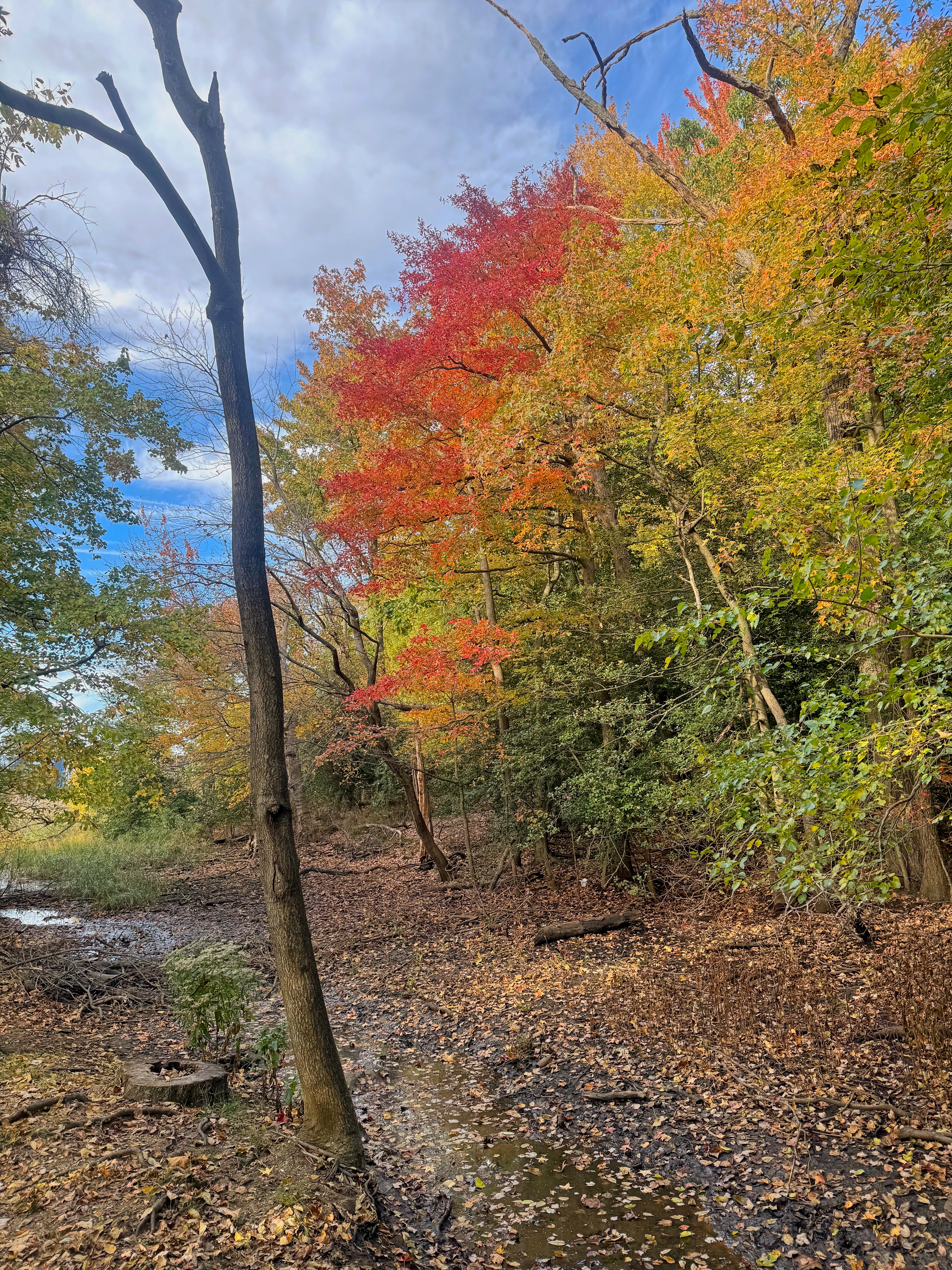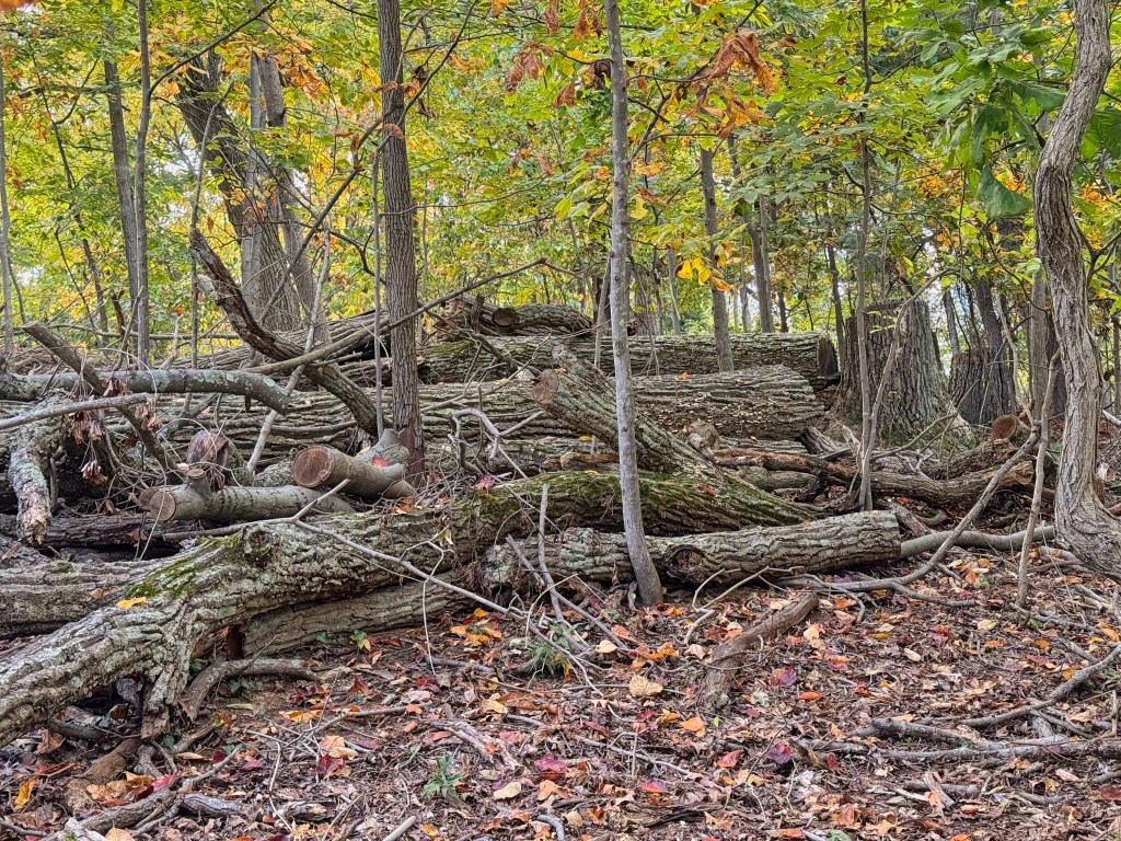 Hidden in the beautiful fall colors of the woods here is the shadow of death. Scattered all over the above image are the dead skeletons of Northern White Ash trees, killed by the emerald ash borer, an invasive insect that is rapidly killing off one of the premier trees of the North American deciduous forests. Many woods look like this: